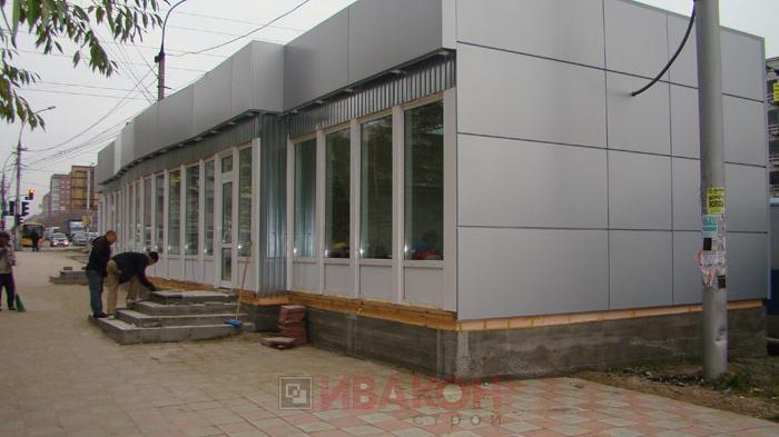 Декоративная отделка фасадов: алюминиевый композит "алюкобонд", пластиковые витражи с двухкамерными стеклопакетами